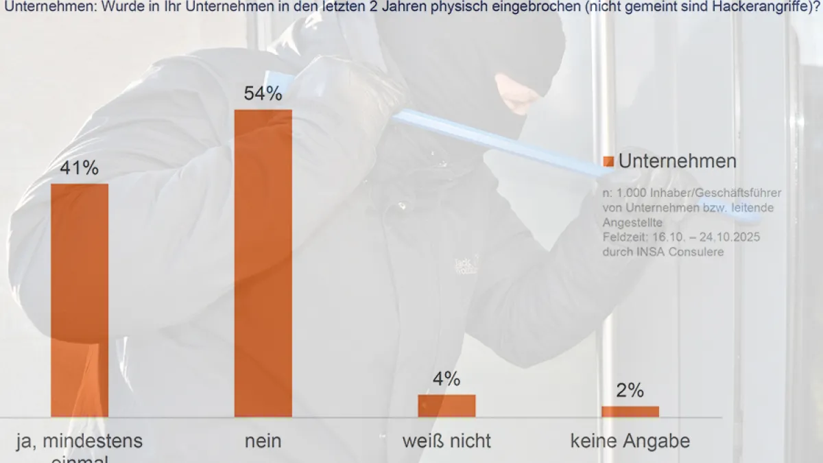 Laut Sicherheitsmonitor 2025 haben 41 Prozent der befragten Unternehmen in den vergangenen zwei Jahren mindestens einen Einbruch erlebt. Bei Privatpersonen liegt der Wert bei nur zwölf Prozent. Entsprechend hoch ist die Risikoeinschätzung: 40 Prozent der Unternehmen bewerten die Gefahr eines physischen Einbruchs als erheblich und treffen gezielte Vorkehrungen. Damit rückt die betriebliche Sicherheit zunehmend in den Fokus unternehmerischer Investitionsentscheidungen.