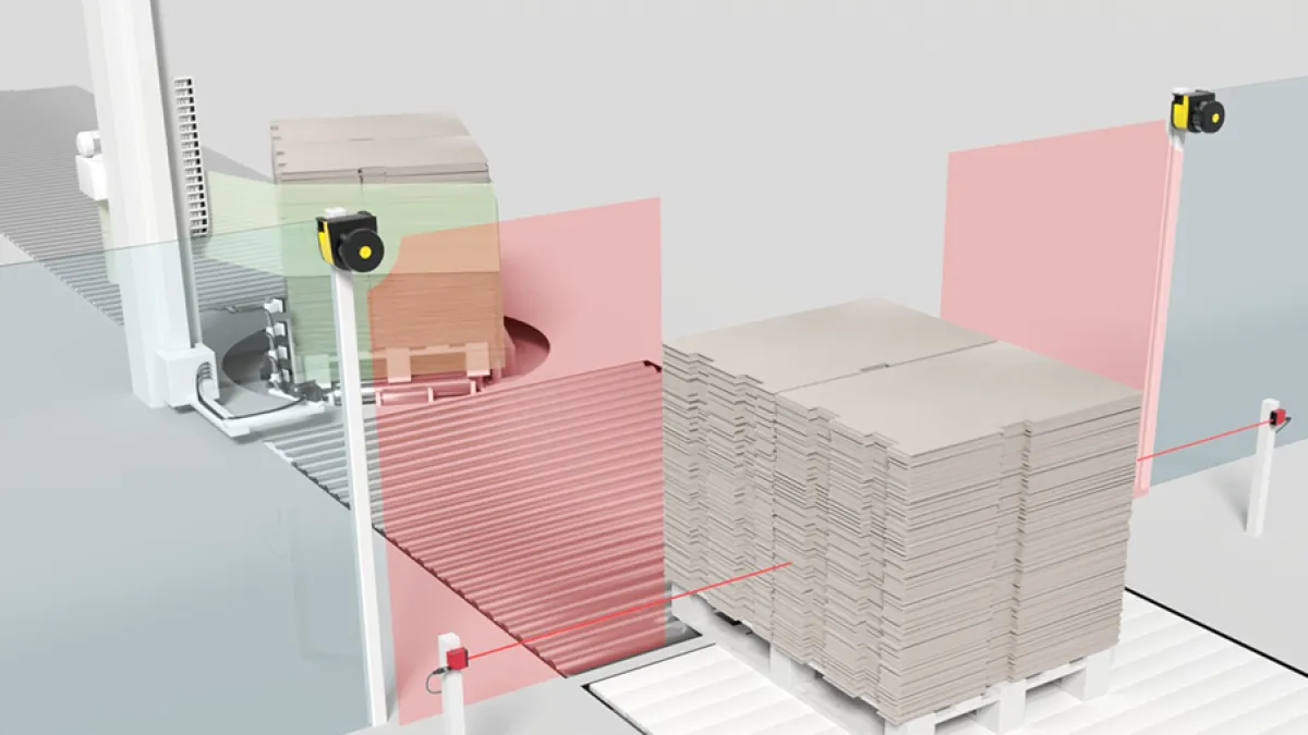 Diese Gefährdung lässt sich durch eine Zugangssicherung mit dynamischer Formatanpassung lösen. Hierbei erzeugen zwei Sicherheits-Laserscanner ein gemeinsames, geschlossenes, vertikales Schutzfeld. Zusätzlich auf beiden Seiten neben der Förderstrecke installierte Abstandssensoren erfassen die Position beziehungsweise Breite der Ware auf der Palette. Alternativ lässt sich dies auch durch die integrierte Messfunktion der Scanner ermitteln. Mit diesen Informationen gibt das Sicherheitssystem im Schutzfeld einen entsprechenden Bereich frei, durch den sich das Transportgut unterbrechungsfrei fördern lässt. Seitlich neben der Ware bleibt der Zugang weiterhin normkonform abgesichert. Nach Durchfahrt des Transportguts wird das Schutzfeld automatisch wieder geschlossen. Sollte eine Person mitlaufen oder -fahren, wird dies auch sicher erkannt. Das neuartige Sicherheitskonzept dieser Sicherheitslösung ermöglicht Performance Level d nach EN ISO 13849-1 zur Sicherheit von Maschinen - sicherheitsbezogene Teile von Steuerungen.